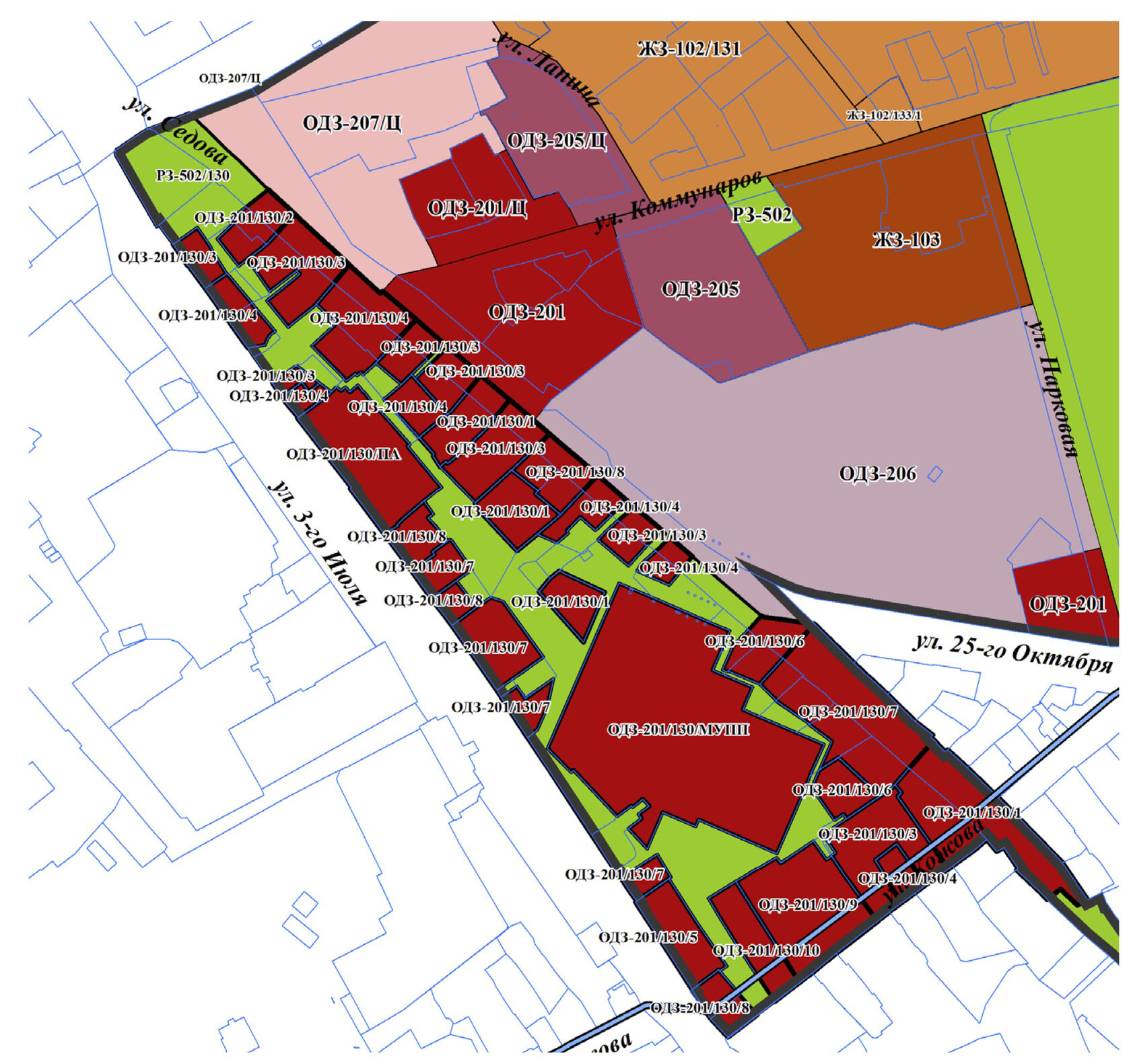 - зонирование территории квартала «по глубине»: дифференцированные требования к высоте застройки (skyline), конфигурации кровли, материалам отделки фасадов.